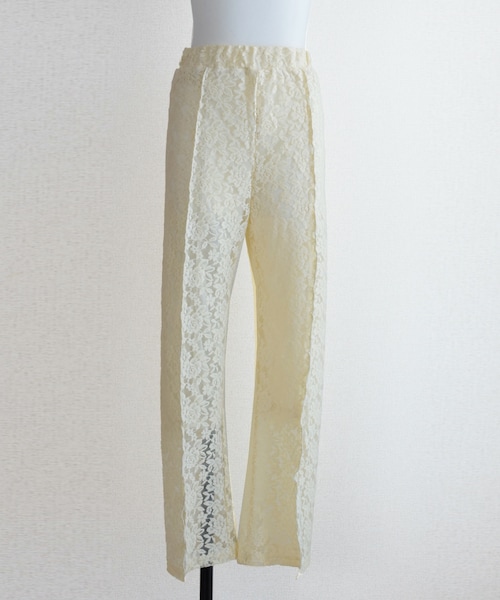 ◆アイテム詳細◆ シアーレースを組み合わせたラフパンツ。 繊細なレースを使用し、ゴム仕様のウエストはさりげないステッチ使いと少し綺麗めに見えるサテン地に。 長めのトップスやドレスとのレイヤードはもちろん、ヒザ辺りまで裏地が付いているので、短めのトップスと合わせることもできます。 ーーーーーーーーーーーーーーーーーーーーーー 【COLOR】アイボリー・ベージュ 【SIZE】FREEサイズ 平置き(㎝) 着丈97 ウエスト31-37(ゴム使用) 裾幅22 股下67 裾スリット18 【素材】表地 ナイロン90% ポリウレタン10% 裏地 ポリエステル100% 【SELECT】PRIVE JOKE