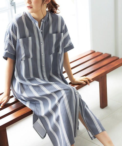 ゆるっとこなれ感を演出。 大人カジュアルなシャツワンピース 〇こなれ感あるサイズ&デザインが大人っぽい 〇シーズンムードを高めるリネン調素材 〇爽やかなストライプ&ニュアンスカラーの3色展開 ■デザイン トレンドのバンドカラー×ワイドシルエットデザインが今っぽいシャツワンピース。 リネン調素材だから、爽やかな印象でさらりと着られます。 程良い丈感のワイドスリーブが、涼やかに日よけ&気になる二の腕もカバー。 前ボタンを開ければ羽織りスタイルでも活躍する、優秀アイテムです。 ■素材 さらりとした涼やかなリネン調素材。 軽やかな着心地がデイリーに活躍! …………………… 透け感:ややあり 厚さ:普通 伸縮性:なし 裏地:なし …………………… ■コーディネート ゆるシルエットのボトムとのレイヤードスタイルがおすすめ。 フラットなサンダル&ナチュラル感あるバッグを合わせると、手抜き感のない大人カジュアルなスタイリングに。 前ボタンを開た羽織スタイルも◎ ニットタンクやデニムとのシンプルカジュアルなスタイルにも、軽やか素材とシルエットで夏らしさを演出してくれます。 ●ポケット有 ※ 商品によって柄の出方が異なる場合があります。(ネイビー系ストライプ) ※ドロップショルダーデザインです。 洗濯:洗濯機使用可 -------------------------------------------------------------- ※サイズ寸法は実際の寸法と多少の誤差がある場合が ございます。 ※ご覧いただいているPC/WEB環境や撮影環境により、 多少色味が異なって見える場合がございます。 【お買い物をよりお楽しみいただく為に】 ▼商品のお気に入り登録をおすすめします♪ 『♡をクリック!』 完売カラーの再入荷やラスト1点の追加、 セールの際の通知を受ける事ができます。 ブランドのお気に入り登録もご一緒にお願い致します。 --------------------------------------------------------------