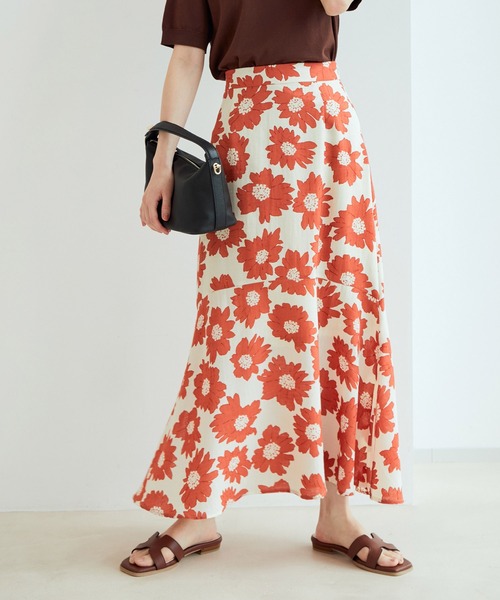 大胆な花柄プリントも大人に着こなせる1着!【デザイン・シルエット】夏を感じる大きめのフラワープリントが入った、ナローマーメイドスカート。綾のある生地を使用し少しナチュラルな印象にしています。大きなフラワープリントは、スタイリングのアクセントにぴったり。サイドにスリットを入れることで歩いた時に足が覗く様にしており、フラワープリントでも子どもっぽくならない様にしています。【素材】扱いやすいポリエステル素材。裏地付きで安心です。【カラー】ブラウン×アイボリー、ブラウン×ブルー、ベージュ×オレンジの3色展開。【おすすめのスタイリング】ボリュームスリーブTシャツ(BVM12450)やフレンチスリーブトップス(BVM12440)との合わせがおすすめ!Tシャツと合わせてカジュアルダウンしても◎-----------------------------裏地:あり光沢感:なし透け感:ややあり(裏地付き)ウエスト:後ろ一部ゴム+ファスナーポケット:なし伸縮性:なし生地の厚さ:薄手ボタン:なしその他仕様:脇ファスナーあり季節:春~秋-----------------------------【モデル着用サイズ】全色モデル身長:160cm、着用サイズ:M※画像の商品はサンプルです。 実際の商品と仕様、加工、サイズが若干異なる場合がございます。