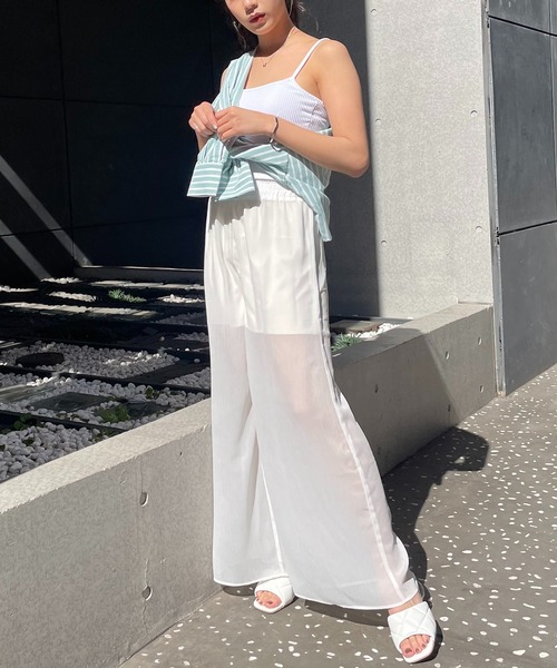 裏地を短くし、透け感が涼しげな印象を演出してくれるワイドパンツ。 ショートトップス合わせはもちろん、ロングトップスとの相性も良いので《62221724 ロングスリットリブトップス》と合わせたスタイリングもオススメです! ゴムウエストなので着脱も簡単で、ストレスフリーな履き心地です。 ********************** 透け感:あり 裏地:あり 伸縮性:なし 光沢感:なし 生地の厚さ:普通 付属品:なし ********************** ※モニター・環境等により実際の商品と多少色味が異なって表示される場合がございます。 予めご了承をお願いいたします。 ※サイト上のカラー名と、お届け商品に記載されているカラー名が異なる場合がございます。 ※他のキャンペーンにより、期間中に価格が変動する場合があります。 ※セールは予告なく終了させていただく場合もあります。