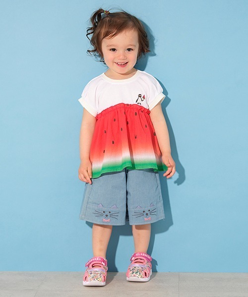 裾のネコさん刺しゅうが可愛らしい4分丈パンツです。 耳部分を立体にした遊び心も目を引くポイント。ウエストにはリボンのさりげないアクセントを効かせて、トップスインスタイルをサマな印象に見せる工夫を凝らしました。後ろポケットの織りネームでバックスタイルも抜かりなく。生地色が透けやすいピンクには後ろに透け防止の裏地つきです。腰周りのフィット感を調節できるアジャスターゴムを備えています。【おすすめの着用時期は春夏シーズン】【透け感】透けない※サックスは透けない/ピンクはやや透ける【生地の厚さ】普通【伸縮性】あり【裏地】なし ※サックスはなし/ピンクは後ろのみあり【ポケット】あり【アジャスター】あり