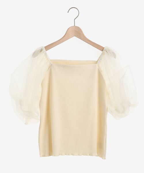 華やかなボリュームのあるシアースリーブが目を惹く、フェミニントップスです♪ 袖部分の透け感がヘルシーな印象も持ち合わせ、裾がメロウになっているところも◎ デコルテ周りをキレイに魅せるネック部分と、身頃は着心地のよいリブ生地になっています☆