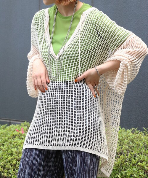 商品名:Sheson(シーズン)Vネックメッシュニットプルオーバー 商品番号:a224738 商品説明:【2022SS】 ・春夏ムードを盛り上げるメッシュニット ・抜け感のでるオーバーサイズ シーズンムード満載の透かし編みのニットプルオーバー。 ゆるメッシュの編地が軽やかで涼し気な印象で、さらっとした肌触りの軽いニット素材で仕上げました。 大きく開けたVネックとゆったりシルエットで、抜け感たっぷりの着こなしに。 ※こちらの商品は素材の特徴上引っ掛かりやすいため、着脱の際はお気をつけください。 *3,980円以上は送料無料(沖縄、離島は9,800円以上で送料無料)となります。 宅配便550円、離島1,210円、沖縄1,430円、メール便一律280円(離島・沖縄含む)です。 ------------------------------------------------------------------------- サイズ:Fサイズ 平置き・実寸: ・着丈 65cm ・身幅 65cm ・肩幅 60cm ・アーム 23cm ・袖丈 50cm ※個体によって若干異なる場合がございます。 **生地詳細** 【裏地】なし【生地の伸縮】あり【生地の透け感】あり 素材:レーヨン89%ナイロン11% 製造:中国 カラー:アイボリー・ブラック