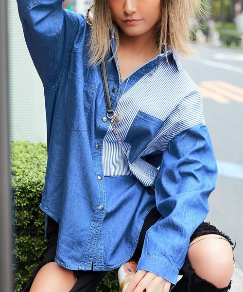 ☆baby Shoopセレクトインポートアイテム☆ デニム切り替えシャツ☆★ 珍しいデザインのシャツが登場!! ライトな着心地で オールシーズン大活躍なデニムシャツ♪ ストリート~大人カジュアルまで 幅広く着回し出来ちゃう万能item☆ ストライプの切り替えがcoolな印象に!! さまざまなスタイリングが楽しめちゃうよ♪ テールカットがシルエットを綺麗に見せてくれるよ!! モデル身長約157cm こちらの商品はインポートアイテムのため縫製・プリントにムラがある場合がございますがこちらは不良品ではございませんのでご了承ください。