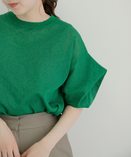 袖のボリューム感が魅力的なサマーニット 【Design】 LAATOらしいデザイン性の高いニットで、立体的な表情を魅せる袖ボリュームデザインが魅力的な1枚。裾に向かって緩やかに丸まったシルエットで、女性らしく柔らかな雰囲気に◎シーズンムード高まる程よい透け感もポイントです。 -LAATO- ”わたしはわたし"をコンセプトとし、 トレンドを意識するのではなく、自分の中で着たい服を確立している人をイメージ。 大人の女性のなめらかさや艶やかさを表現するデザインや、柔らかいカラーが特徴的なブランド。 シーズン:2022 S/S model : 162cm 着用サイズ : FREE ----------------------------- 《スタッフ着用コメント》 [スタッフA] 年齢 : 20代前半, 身長 : 160cm, 体型 : 普通 普段の着用サイズ : M 【着用カラー/サイズ】ミドリ/FREE 【サイズ感】首周りはコンパクトなサイズ感ですが、腰辺りが隠れる丈感なので安心感があります! 【素材感, 着心地】さらっとした生地感のニットなので、夏場も涼しく着用できそうです! 【その他】お袖のリブがしっかり止まるので、立体感のあるデザインが可愛いです!1枚でお洒落見えするデザインです◎ ----------------------------- ※商品画像は、光の当たり具合やパソコンなどの閲覧環境により、実際の色味と異なって見える場合がございます。予めご了承ください。 ※商品の色味の目安は、商品単体の画像をご参照ください。 ----------------------------- 透け感:あり 伸縮性:あり 裏地:なし 光沢:なし ポケット:なし -----------------------------