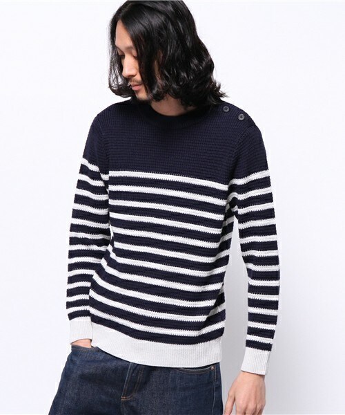◆FREDY&GLOSTER◆ イタリー糸"FALCO"を使用したパネルボーダーのプルオーバーニット。フランス海軍のニットをモチーフにしており、肩のアンカー釦がアクセントになっています。イタリー糸を使用しているので、重くなりがちな立体的な編地は思いのほか軽くアウターのインナーにもオススメです。シャツとのレイヤードで、ハイネックの表情が出やすいのも特徴です。 店舗へのお問い合わせの際は下記品番をお伝えください。 品番:[FREDY&GLOSTER]VW452003