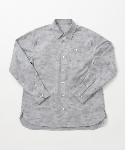 rikolekt 2022-23秋冬先行予約スタート受付期限 5月30日 PM23:59織りの色を変えることによる切替デザインを施したデザインシャツ、シンプルで洗練されたシルエット、カットが入った上品なシェルボタン、ステッチレスのミニマルな衿が特徴です。※ユニセックスでお使いいただけるアイテムです。"fog light"深い霧の立ち込める、ある夜を歩いた日の記憶。水彩画を描いた後に、ハーフトーンに変換した図案を、プリントではなく、ジャカードで織り上げた生地を使用。たてよこで複雑に交差しあう姿が、プリントでは出せない繊細な奥行きと、詩的な情景にマッチしたテキスタイルが出来ました。