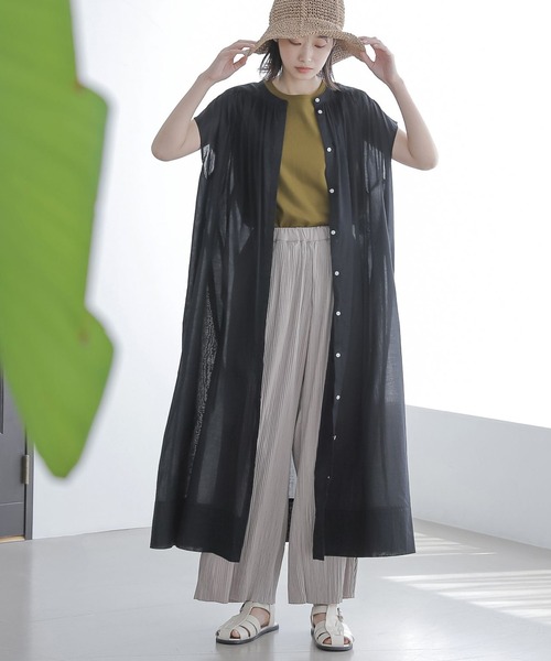贅沢にとったギャザーと、たっぷりとしたシルエットが魅力のワンピース。フロントは比翼デザインで、シンプルながらもボリューム感が映えるデザインに。腕まわりがキレイに見えるように、肩の開きを細かく調整したスリーブレスタイプ。【素材】コットン100%で、軽くやや透け感のある素材を使用。【スタイリング】パンツとレイヤードして、ワンピースを主役にしたスタイリングに。また、ジレのように羽織り使いするのもおすすめです。