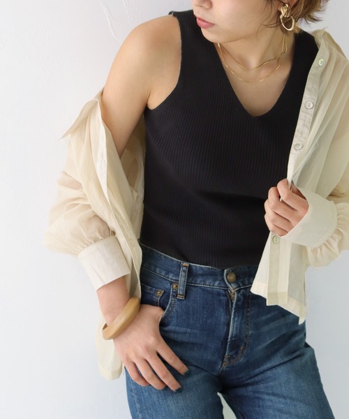 インナートップスとしてチラ見せでこなれ感♪ すっきり上品映えニットタンクトップ! WEB限定SS ITEM 細めでありつつ凹凸感のあるリブ編みを使用した夏服にぴったりなニットタンクトップス。 サマーニットでありつつ透けないように密度の高いリッチな質感に仕上げました。 少しだけ深めのVネックが首回りをよりスッキリと見せてくれるのが嬉しいポイント。 タイトでありつつ、スタイルアップ効果のあるシルエットに仕上がるので 1枚で着たり、メッシュベストとあわせるのもオススメ。 シャツを羽織ってさらっと夏スタイルをお楽しみ頂けます。 ≪Styling≫ シアーシャツやストライプオーバーシャツなど、 こなれた羽織りスタイルにオススメ◎ トレンドライクなメッシュベストのインナートップスとしても 重宝します。カラーによって印象が変わるので イロチ買いで気分によって違いをお楽しみいただけます。 ≪Fabric&Detail≫ 伸縮性・・・あり 透け感・・・なし 厚み・・・★★☆☆☆ 手洗い 可 ▼《お気に入り登録》のおすすめ▼ 【商品のお気に入り登録】 気になるアイテムのハートマークを押してお気に入り登録すると 完売カラーの再入荷通知やラストの通知、セール通知を受け取ることができます。 【ブランドのお気に入り登録】 新商品や再入荷など、いち早くブランドのお得な情報を受け取ることができます。 ぜひご利用いただきお買い物をお楽しみください。 ≪Brand introduction≫ 【She mo shelly / シーモシェリー】 定番で使えるベーシックデザインからディティールに拘ったデザインまで、 トレンド要素をバランス良く落とし込んだ商品ラインナップをご提案しています。 ※撮影場所により、実際の色味と若干異なる場合がございます。 あらかじめご了承くださいませ。