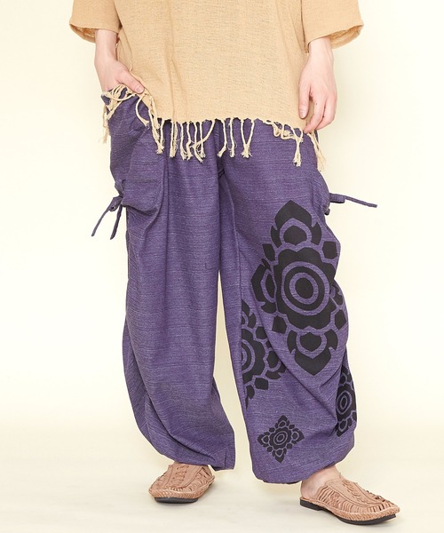 タイ直輸入のコットンサルエルパンツ。左前にプリントされた、切り絵のようなロータス(蓮)模様がポイント。コーデしやすい渋めのカラー。男女問わずユニセックスでご着用いただけます。夏のエスニックスタイルに◎・裾ゴム仕様・ウエストゴム紐仕様 MAX~112cm・両サイドの紐をしぼってギャザーを寄せると、シルエットに変化を付けられます。お好みのシルエットにしてお楽しみください。※こちらの商品は1点1点職人による手作りとなります。その為、形や色合いなど若干異なる場合がございます。あらかじめご了承ください。Amina Collection Co.,LTD.