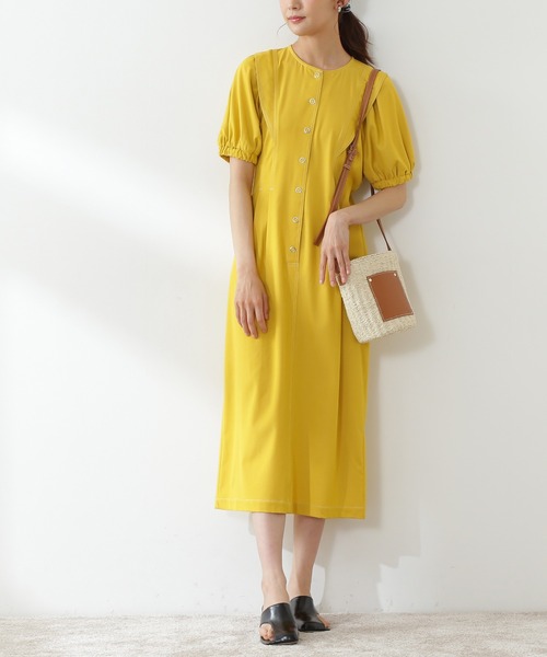 甘くなりすぎないようオトナ仕様に仕上げたワンピース。旬なパフスリーブや肩まわりの生地を内側にむけるなど、縦のラインを強調しながらキレイなシルエットをキープできるデザイン。フロントのドットボタンもアクセントとなり、夏にぴったりのカラーや素材感をいかした1着です。
