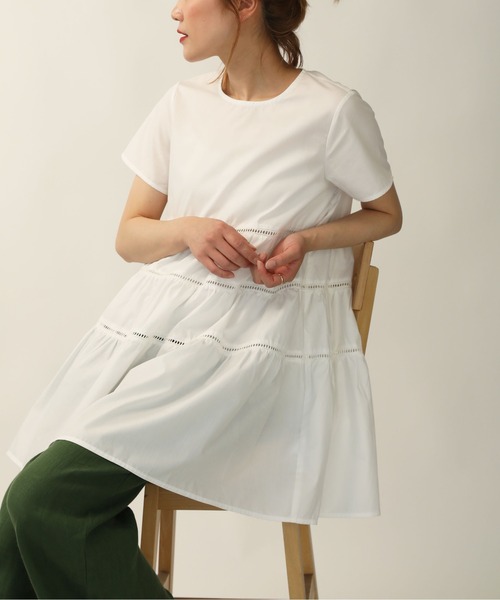 ふんわりシルエットが可愛いティアードチュニック。見た目も爽やかな布帛生地を使用。レース+ティアードデザインが施されており、ふんわりとしたシルエットで体型カバーもしてくれます。スッキリとした細身のパンツやテーパード等のメリハリのあるスタイルにもワイドパンツやリネンパンツなどのゆったりとしたパンツ合わせでリラクシーなスタイルにも◎です。※撮影場所や明るさにより実際の商品と色味が若干異なる場合がございます。 ☆商品のお気に入り♡登録を押せば”再入荷通知”や”残りわずか通知” 値下げのお知らせが届きます!お気に入りのブランド登録していただければ新商品入荷のお知らせも届きますので是非登録してみて下さい