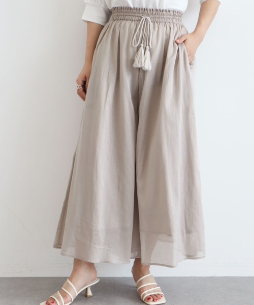 ふんわりとしたスカート見えするシルエットが可愛らしいインド綿素材のボリュームパンツ。気になるレッグラインを拾わず、さりげなく細見え効果が期待できるのも魅力のひとつ。ウエストはゴムギャザー仕様で安心感があり、タッセル付きのドロスト紐で調整も可能です。裏地付きで穿きやすく、デイリーユースにも重宝すること間違いなし◎【素材】透け感[やや有り]裏地[すべて有り]伸縮性[無し]光沢感[無し]生地の厚さ[薄手]付属品[無し]ポケット[有り]前2つ● Green Parks ●(グリーン パークス)20以上の人気ブランドを取り扱うアパレルセレクトショップ。ベーシックながらもさりげなくトレンドを取り入れたオリジナルブランドchocol raffine robeも展開。▼ 商品のお気に入り登録がおすすめです ▼商品ページ内のハートマークをクリック。完売時の再入荷や、最後の1点の通知、コーディネート画像がアップされたとき、お得なお値下げの際の通知を受ける事ができます。【お知らせ】ページでも通知が確認できます。
