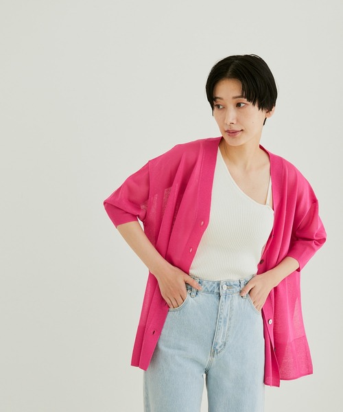 ピンクはWEB限定カラー!冷房対策・紫外線対策・日除けなど夏の羽織りにぴったりなシアー素材の半袖サマーカーディガン■POINT 身体のラインを拾わない、ニュアンスのでるオーバーシルエットのシースルーカーディガン。 さらりとした肌さわりと程よい光沢感のあるシアーな糸を使用。 開きすぎないVネックなので上までボタンをとめるとプルオーバーの様にも着こなせます。 袖口を少し上げるとパフスリーブの様にボリューム感もでて女性らしい印象に。 ゆったりとしたシルエットなので様々な体型の方にオススメです。 軽量なので持ち運びにもぴったり◎ ご自宅で手洗い可能なのも嬉しいポイント。 これからの季節、紫外線・日除け・クーラー/冷房対策に1枚あると便利なアイテムです。 ■COORDINATE ショートパンツと合わせた大人カジュアルスタイルや ノースリーブのワンピースを合わせた大人っぽい着こなしもオススメです。 サイドにスリット入りなので前だけインして着ることも可能です。 ■モデル身長:167cm 着用サイズ:F ----------------------------- 裏地:なし 光沢感:なし 透け感:あり 伸縮性:ややあり 生地の厚さ:やや薄手 -----------------------------