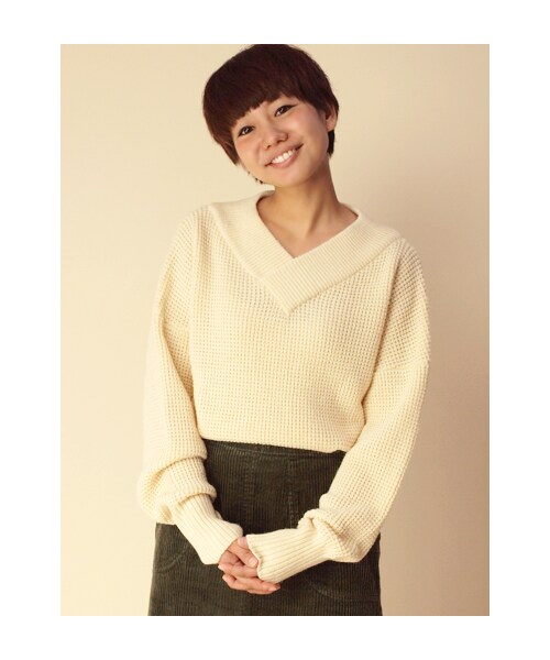 すっきり見せてくれるVネックのニットプルオーバー。ドロップショルダーがカジュアルながらもこなれ感をプラスしてくれます。