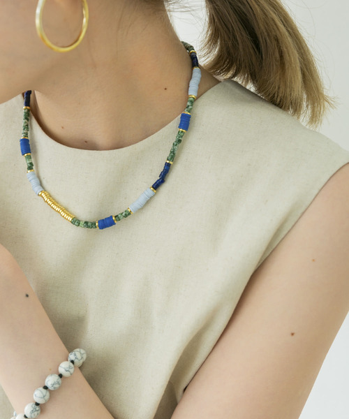 1点投入でコーディネートに華やかさをプラスするネックレス。 無地でシンプルなトップスと合わせるのがおすすめ。 ※商品画像は、光の当たり具合やパソコンなどの閲覧環境により、実際の色味と異なって見える場合がございます。予めご了承ください。 ※商品の色味の目安は、商品単体の画像をご参照ください。