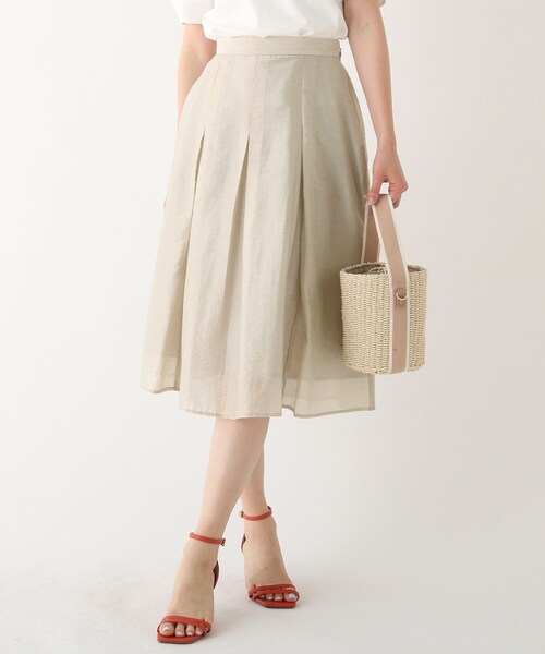 ------------------------------------------------- ▼ お気に入り登録 500人突破!------------------------------------------------- ふわりと華やぐシャンブレースカート 【素材】 再生繊維を混紡したシャンブレー素材を使用。 しなやかながら程よいハリがあり、今年らしいこなれ感のある素材感です。 見る角度によって異なるカラーがでる、シンプルなデザインでも華やぐ素材です。 ※裏地あり 【デザイン】 ふわりと広がるタックが優しげなフレアシルエット。 バックゴム仕様でリラクシーにフィット感のある着用感。 フロントには芯を張っているのでタックインでもカジュアルな印象にならず、きちんとした印象に。 シルエットを崩さないサイドポケットも嬉しいポイント。 ※ポケット数:横×1 【こだわり】 スタイリングに強弱が出る光沢感が今年らしいシャンブレー素材。 ぱきっとしたカラーでもカジュアルにならない様、少し短めのひざ下丈で清涼感と上品さを両立する絶妙な丈感に仕上げてました。 ※36(S)・42(LL)サイズはWEB限定サイズ こちらの商品は主に夏に着用いただける商品です。 モデル情報:身長166cm B80 W58 H83 着用サイズ:38(M) 店舗へのお問い合わせ商品番号:C58-74016 ●製品寸法: 36(S):W60~64cm H94cm 総丈71cm 38(M):W63~67cm H100cm 総丈72cm 40(L):W66~70cm H106cm 総丈73cm 42(LL):W70~74cm H112cm 総丈75cm 備考: