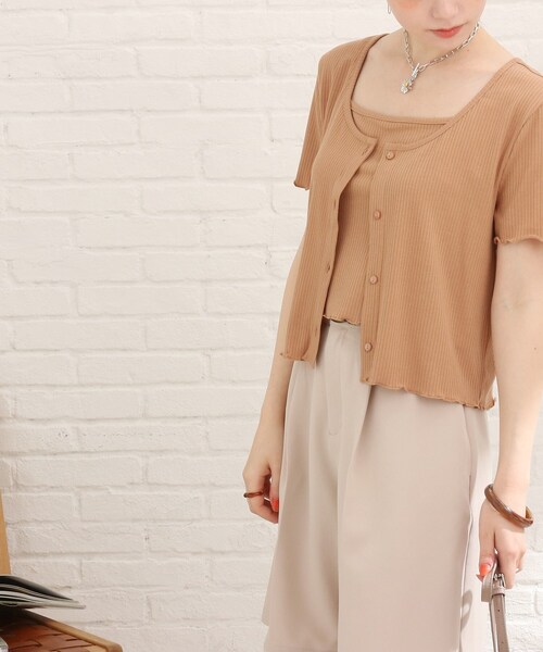 【デザイン】さらっとした着心地のカットソーに同素材のキャミソールがセットになったお得アイテム!デコルテをきれいに見せてくれるオーバークルーネックデザイン。袖口や裾のさりげないフリルが華奢で可愛いです。前開き釦なのでカーディガンとしても着ていただけます。オフホワイト、ライトグリーン、イエロー、ブラック、グリーン、キャメルの全6色とカラーバリエーションも豊富です!【生地感】通気性・伸縮性ともに富んでおり、程よい薄さにさらっとした着心地のコットン(綿)混素材です。※こちらの商品はやや透け感があります。※製品寸法は平置きのスペックとなっております。こちらの商品は伸縮性があります。#CutieBlonde#Cutie#cutieblonde#cutie#キューティブロンド#キューティ#20代#30代モデル情報:身長160cm B78 W59 H85 着用サイズ:02(M)店舗へのお問い合わせ商品番号:256-34311●製品寸法:01(S):カーディガン着丈45cm カーディガンB78cm カーディガン袖丈18cm カーディガン肩幅37cm キャミソール総丈38cm キャミソール着丈27cm キャミソールB70cm02(M):カーディガン着丈47cm カーディガンB83cm カーディガン袖丈18cm カーディガン肩幅38cm キャミソール総丈39cm キャミソール着丈29cm キャミソールB73cm03(L):カーディガン着丈49cm カーディガンB88cm カーディガン袖丈19cm カーディガン肩幅39cm キャミソール総丈40cm キャミソール着丈31cm キャミソールB76cm備考: