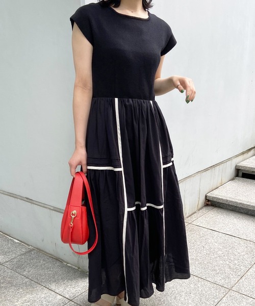 ニットと布帛をドッキングさせたデザインワンピース。【素材】ニット部分にはコットン(綿)とレーヨンナイロンを混合したしっかりとした肉感の糸を使用。布帛部分にはやわらかく軽やかでしぼ感のある、コットン(綿)素材を使用し初夏らしい雰囲気に◎裾部分に引っ張られないよう、しっかりとしたニット素材で安定感もあり、裾部分は軽やかなデザインに仕上げました。※ライトグレー(011)はやや透け感があります。※スカート部分のみ裏地あり【シルエット】ウエスト位置を少し高めに設定し、腰の位置を高くみせてくれるフィットアンドフレアのシルエット。ニット部分はなるべくすっきりとさせ、裾のふんわりボリューム感をより演出したデザイン。ふんわりと広がるフレアシルエットが華やかにしてくれる、ドッキングワンピースです。※ポケットなし【こだわり】一枚でスタイリングが完成するデザインニットワンピース。毎回人気の異素材デザインワンピースですが、今回はスカート部分にトレンド感のある配色パイピングとタックデザインを施しました。脇にコンシールがついており、すっきりと着用できるのもポイント◎マシンウォッシャブル機能つき。【スタッフコメント】RINA(158 /骨格ウェーブ/ブルべ)シックな雰囲気且つ、女性らしさも忘れないフィットアンドフレアで、パイピングデザインが今っぽくてかわいいです!身頃のニット部分は透けが気にならない安心感のある素材で、スカート部分は軽やかな素材です!肩までしっかり覆うフレンチスリーブなので肩幅や腕の太さをカバーしてくれます!こちらの商品は主に夏に着用いただける商品です。モデル情報:身長166cm B80 W58 H83 着用サイズ:38(M)店舗へのお問い合わせ商品番号:N02-54019●製品寸法:36(S):着丈116cm B72cm 肩幅45cm W66cm H102cm38(M):着丈119cm B74cm 肩幅47cm W68cm H104cm備考:
