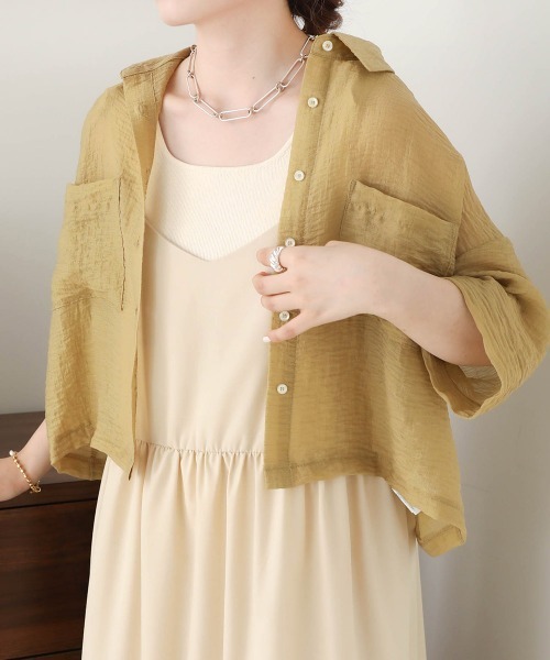 ●Bab● ■POINT トレンドのコンパクトな丈の半袖シャツブラウス。表面に凹凸のあるシアー素材は羽織るだけで軽やかな印象を与えてくれるアイテムです。 若干透ける素材なのでインナーとのレイヤードもヘルシーなスタイルにしてくれる1枚。ゆったりしたシルエットがリラクシーな着こなしを実現してくれます。 ■FABRIC 表面がぽこぽこした透ける素材なので単調になりすぎない素材のコントラストが楽しめる1枚。 さらりとした合繊素材でしわになりにくいので軽いお出かけにも持ち歩きたいシャツブラウスです。 ■COORDINATE 短めのレングスなのでハイウエストのボトムを合わせるだけでスタイルアップ効果が叶うアイテム。ただ短すぎないショート丈で取り入れやすい丈感に仕上げています。 フロントのボタンを閉めてシャツとして合わせるのはもちろん、ボタンを開けて羽織りっぽく着用しても可愛く着こなせます。 ボトムと合わせてカジュアルに着こなすだけでなく、インナーにワンピースを合わせて女性らしいコーディネートにも合うシャツです。 ………………… 透け感:あり 裏地:なし ………………… ※撮影環境により、多少実際のカラーと異なる場合がございます。また、携帯やスマートフォン、パソコンなどの画面上と実物では多少色が異なって見える場合がございます。ご了承下さいませ。 ※画像の商品はサンプルのため、実際の商品と若干仕様が異なる場合がございます。 ※濃色品は、過度な摩擦や濡れた状態での摩擦により、色落ち・色移りをする恐れがあります。 ※この商品は、素材の特性上、洗濯の際に多少の縮みが生じる恐れがあります。洗濯後は形を整えてから干してください。 ※その他お取り扱いに関しましては、商品に付属のアテンションタグをご覧ください。 ★商品のお気に入り登録 再入荷やラスト1点のお知らせ、セール情報などお知らせを受け取ることができます! ★ブランドのお気に入り登録 新商品や再入荷などのお得な情報を受け取ることができますので、是非ご登録ください。