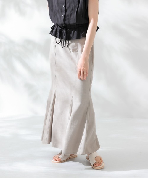 【カジュアルさと女っぽさを兼ねそろえた、今穿きたいマーメイドスカート】 ウエスト位置から適度に身体に沿ったカーブシルエットと、裾にかけて広がるデザインが女性らしさを引き立てるスカート。リネン混ならではのナチュラルさは抜け感のあるスタイリングを仕上げ、ウエストにはバックゴムを採用し楽な穿き心地を実現しました。合わせるものを選ばない万能なカラーリングで、この夏ヘビロテ間違いなしの1着となっております。 POINT ・夏に最適なリネン混素材 ・女性らしさを引き出すマーメイドシルエット ・飽きのこないナチュラルなカラーリング COORDINATE コンパクトなトップスを合わせた女性らしいスタイルを楽しんだり、あえてスポーティーなシャツやBIG TEEでハズしてもサマになります。 ※この商品は、縫い目などに過度な力が加わることで滑脱(縫い目が滑って開いたり、縫いしろが抜ける)する場合がありますのでご注意ください。 ※この商品は麻素材を使用しているため、ネップや織りキズのようなものが見られますが不良品ではございません。天然の麻の特性としてご理解ください。 ※その他お取り扱いに関しましては、商品に付属のアテンションタグをご覧ください。 ※商品画像は、光の当たり具合やパソコンなどの閲覧環境により、実際の色味と異なって見える場合がございます。予めご了承ください。 ※商品の色味の目安は、商品単体の画像をご参照ください。 ▼お気に入り登録のおすすめ▼ お気に入り登録商品は、マイページにて現在の価格情報や在庫状況の確認が可能です。 お買い物リストの管理に是非ご利用下さい。素材感 透け感:なし 伸縮性:なし 裏地:あり 光沢:なし ポケット:なし One