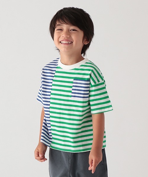 夏の定番ボーダーデザインにアレンジを加えたTシャツです。左右で異なるカラー切り替えによって、シンプルながらもインパクトのあるデザインに。ボクシーなシルエットで着心地にリラックス感があるのも魅力です。内側にお名前を記入できるタグつき。※80、90サイズのみ肩開き【透け感】透けない【生地の厚さ】普通【伸縮性】あり【裏地】なし【ポケット】あり