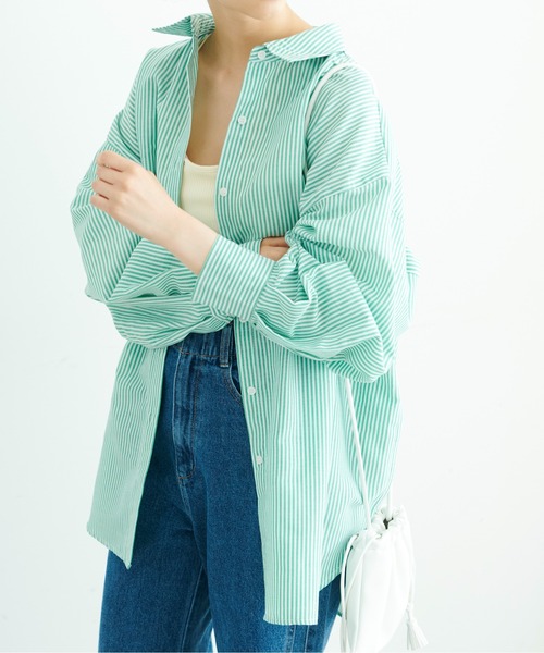 着回し力抜群のストライプシャツ。トレンド感ありながら、長く着用できるベーシックなデザインです。 ほどよくゆったりとしたサイズ感もポイント。 ボタンを留めてトップスとしてだけでなく、たすき掛けやシャツ羽織りをするなど、幅広いスタイルに活躍できます。 今年はカラーインナーとのレイヤードがおススメです。