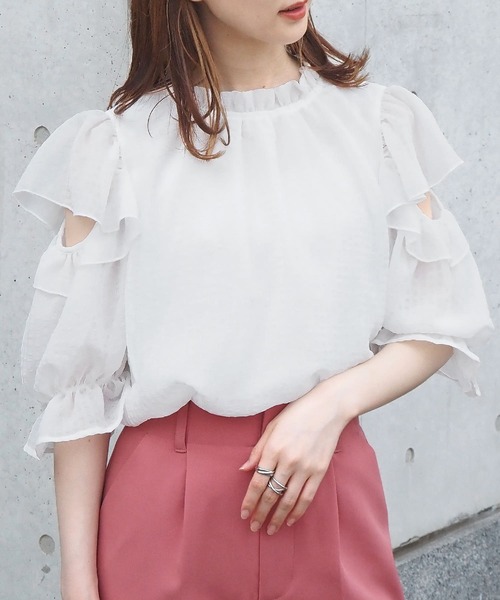 フリルやオープンショルダーデザインが華やかなデザインブラウスです。シャドーチェック柄を思わせる立体的な素材感と、涼し気な透け感が高見えする1枚。袖丈は肘にかかる長さなので、気になる二の腕もカバーできます◎肩のフレアデザインや袖口のギャザー、バックリボンなど細かなディテールにもこだわりました。ベーシックなデニムやナロースカートに合わせるだけで着こなしが決まる、主役級のアイテムです。※実店舗と発売時期が異なることがございます。あらかじめ御了承ください。※撮影場所やお使いのモニター環境により若干お色味が異なる場合がございます。※お取り扱いに関しましては、商品に付属のアテンションタグをご覧ください。※サイト上のカラー名と、お届け商品に記載されているカラー名が異なる場合がございます。※生産時期により色・素材・サイズ感など多少異なる場合がございます。予めご了承ください。サイズ身幅【51cm】肩幅【32cm】総丈【54cm】そで丈【27cm】※こちらの商品はワンサイズのみとなります。【お買い物をより楽しんで頂くために】▼商品のお気に入り登録♡のクリックで商品のお気に入り登録が完了!完売カラー再入荷のお知らせ、ラスト1点のお知らせ、セールのお知らせを受け取ることができます。▼ブランドのお気に入り登録新商品や再入荷のお知らせ等、いち早くブランドのお得な情報を受け取ることができます。