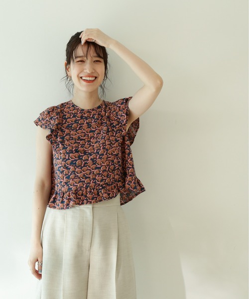 華やかなフリルディテールをあしらったプリントブラウス。肩まわりと裾のフリルデザインがフェミニンな雰囲気をプラスし、適度に肌ばなれしたシルエットで夏に涼しく着用できます。裾をアウトしまま着用できるショート丈なので、スタイルアップ見えするのもポイント。ハイウエストのIラインスカートやパンツなど、シンプルなボトムスを合わせるだけでサマになる一枚。