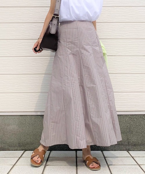 メモリー素材のストライプスカートです。ワントーンのストライプなので、落ち着いたオトナな雰囲気に。適度なハリ感のあるメモリータフタ素材なので、きれいなフレアシルエットのスカートです。長すぎない、足首が見える絶妙な丈感が◎ウエスト部分はゴム仕様になっていますが、外から見えないように中に付けています。inして着たときも、きちんと感のあるきれいなシルエットに。《インフォメーション》◆商品のお気に入り登録完売していても再入荷時に再入荷通知を受け取ることができますので、是非ご登録ください。◆ブランドのお気に入り登録新商品や再入荷などの情報を受け取ることができますので、是非ご登録ください。