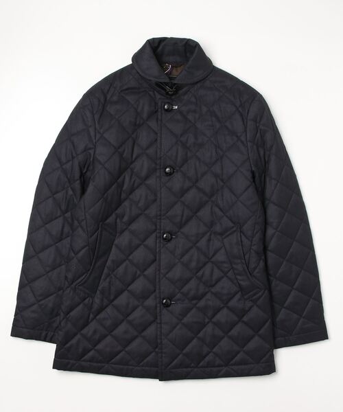 表地は中わた入りのキルティング素材で、表面にプリント加工をかけた合繊素材を使用。衿のベルトは皮調の高級感ある附属を使用。釦はクルミ調釦を使用。細身のスタイリッシュなシルエット。腰部分のポケット袋地は起毛裏地を使用。寒い日でも温かいです。