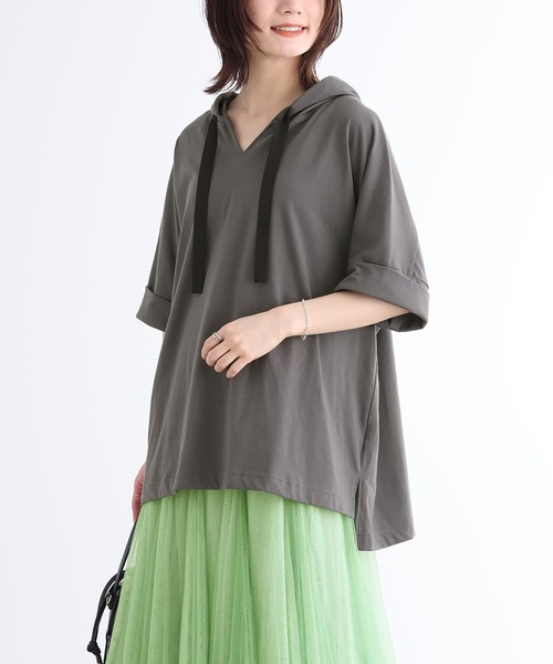 ■デザイン ゆるっとしたシルエットが着用するだけでこなれ感たっぷりのパーカー。涼し気なキーネックと配色のフード紐がポイントになったデザインです。ベーシックからアクセントカラーまで、色違いで揃えたくなる豊富なカラー展開も魅力的。袖はそのままでも折り返しても着用できるデザインで、折り返しても縫い代が見えない仕様になっています。前後差のある丈デザインとサイドスリットで抜け感をプラスします。 ■素材 程良い厚みのコットン混のカットソー生地で、さらっと快適な着心地。 ※淡色はやや透け感がございますのでインナーのご着用をおすすめいたします。 ■コーディネート カジュアルからモードまで、ボトムスを選ばず幅広い着こなしをお楽しみいただけます。