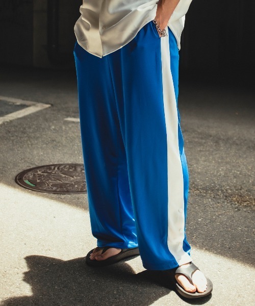 ストレッチ性のあるジャージ素材を使用したリラックス感のあるワイドトラックパンツ。●適度な伸縮性と通気性があるジャージ素材を採用●ゆったりとしたワイドパンツシルエット●ゴムウエスト、ドローコードを装備しワンマイルウェアなイージーパンツ●サイドに太いラインデザインがアクセント●定番のブラックと差し色のブルーとグリーンをセレクトカットソーやスウェットとの王道ストリートコーデはもちろんシャツアイテムやきれいめファッションのハズしとしてもオススメの一本。韓国ファッションやスケーター、ダンサーコーデだけでなくどこかレトロな佇まいは古着MIXスタイルにも◎。男性はもちろん、女性にもオススメしたい一枚です。