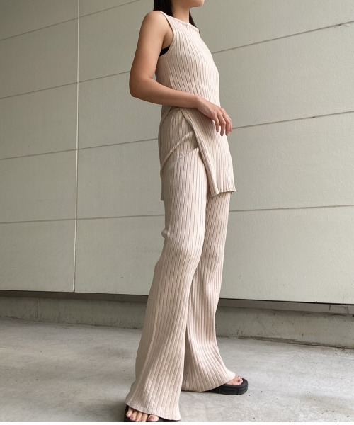 ■デザイン着るだけでコーディネートが完成するセットアップ。 顔周りをすっきり見せてくれるUネックラインやサイドに施されたスリットが抜け感のあるトップスと ウエストゴムでストレスフリーな着心地かつ足を綺麗に魅せてくれるフレアシルエットが美しいパンツがセットになった、 リブ編みが縦のラインを意識させ、すらりとスタイルアップも叶う一着です。 爽やかなカラーリングが夏気分を高めてくれます。 ■素材感・動きやすい軽やかなリブニット素材で伸縮性も抜群。■スタイリングリラックス着ワンマイル着としてもお使いいただけるセットアップは 上からシャツを羽織ったり、シンプルなスタイリングのポイント使いにしていただいても〇 トップスはデニムと合わせてサイドスリットから肌見せをしたり、 ボトムはトレンドのカレッジTシャツなどと合わせたカジュアルなスタイリングのポイントにもなるため、 セパレート使いもおすすめです。※モデル着用画像はイメージのため、実際の商品のお色と異なる場合がございます。 商品の詳細画像が実際の商品に近いお色味となります。『AMAIL (アマイル)』MATURE&JILL『エレガンスな服をスタイリングでカジュアルに、カジュアルな服をスタイリングでエレガンスに』トレンドのファッションを自分らしくスタイリングしたい、大人だからできる、余裕を感じられるファッションを楽しめるアイテムを提案します。instagram:@amail_official『ディレクター』猪島 愛ファッションや美容、ライフスタイルについて幅広く配信。女性らしいカジュアルスタイリングが人気。instagram:@aiinoshima三方美穂一児のママ。カジュアルになりすぎないママファッションから美容、子育てについても幅広く配信。キレイめカジュアルスタイリングが人気。instagram:@mihomikata----------------------------