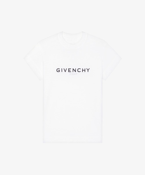 ソフトジャージー Tシャツ。 カラー : ホワイト。 フロントとバックにリバースエフェクトを効かせたGIVENCHY PARISシグネチャープリント。バックにブラックのスモール4Gエンブレムプリント。 スリムカット。