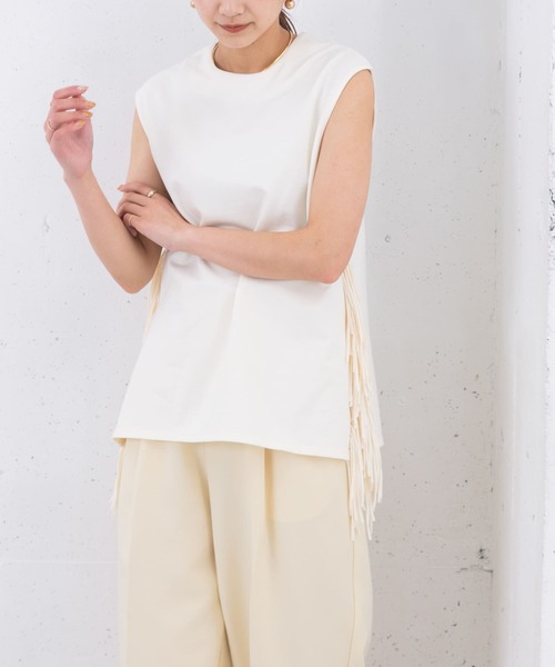 【表情のあるスタイリングを仕上げるフリンジトップス】サイドにあしらったフリンジが夏らしさを引き立てるノースリーブトップス。程よく肉厚な素材でカジュアルすぎず、纏うだけでこなれ感を演出します。リラクシーなサイジングと絶妙にドロップしたショルダーデザインで、女性らしさのある華奢見えシルエットを完成させます。万能なBLACK&BUTTERをご用意しました。POINT・抜け感を演出する絶妙なサイジング・モードな印象を仕上げるフリンジデザイン・飽きの来ないカラーリングCOORDINATEモードに仕上げるならシャープなボトムがおすすめ。柄物ボトムと合わせると、よりトレンディなスタイリングが完成します。※この商品はデザイン上、一部を裁ち切り状態にしています。そのため、着用や洗濯の繰り返しでほつれることがあります。※商品画像は、光の当たり具合やパソコンなどの閲覧環境により、実際の色味と異なって見える場合がございます。予めご了承ください。※商品の色味の目安は、商品単体の画像をご参照ください。素材感透け感:ややあり(BUTTERのみ)伸縮性:ややあり裏地:なし光沢:なしポケット:なし▼お気に入り登録のおすすめ▼お気に入り登録商品は、マイページにて現在の価格情報や在庫状況の確認が可能です。お買い物リストの管理に是非ご利用下さい。