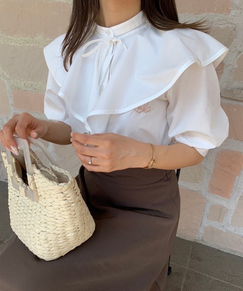 NICECLAUP 2022 early summer Collection 人気スタッフ考案アイテム! 取り外し可能なケープ襟がセットになったノーカラーブラウス。 大きめなケープ襟はフェミニンな印象を与え、付け襟として他のトップスに合わせるのも可能です。 襟を外すとシンプルなノーカラーシャツになるので、ON、OFF両方お使い頂けるのも嬉しいポイント。 シャツの胸元には、さり気ない刺繍をあしらい襟無しでもシンプルになりすぎずお使い頂けます。 丸みのあるスリーブデザインですが、肩のボリュームを抑えている為バランスよく着こなせます。 お尻が隠れる少し長めの丈感なので、体形カバーにも◎ タックインはもちろん、アウトスタイルや羽織としてもお使い頂ける着回し抜群アイテムです。 ■オススメスタイリング シンプルにデニムで合わせるのはもちろん、ロングボトムと合わせて綺麗目コーデにも◎ キャミワンピースやサロペットのインナーとしても使うのもオススメです。 丈感が長めなので小柄な方には、ミニワンピースとしても楽しめます。 襟を外せばオフィスカジュアルコーデにも◎ 襟をTシャツやスウェットにつけたレイヤードコーデはオシャレ度もアップしオススメです。 ------------- 裏地:なし 伸縮性:なし 生地の厚さ:普通 生地の重さ:普通 ------------- ※サンプルでの撮影のため、実際のものと仕様や色が異なる場合があります。 ※室内、室外での撮影のため実際より明るく映っていたり、暗く映っていたりする場合がございます。 ※品質表示を必ずご確認下さい。 【商品のお気に入り登録】 完売カラーの再入荷や、ラスト1点のお知らせ、セールの通知を受け取ることができます。 【ブランドのお気に入り登録】 新作入荷や再入荷情報など、ブランドの情報をいち早くお届けします。 ぜひご登録ください♪