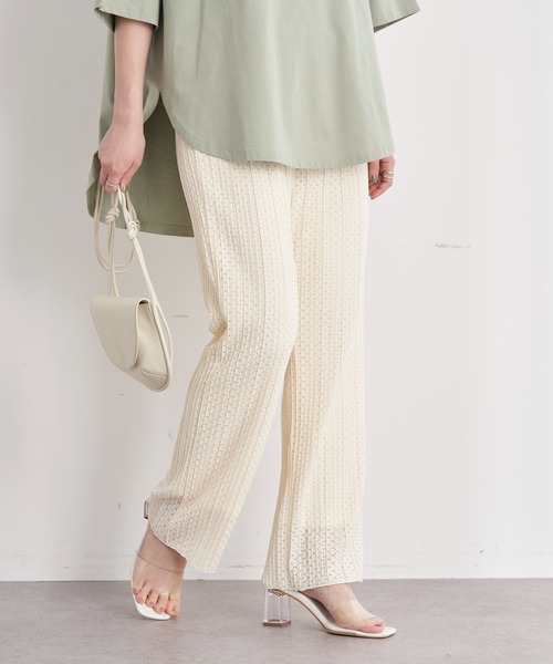 繊細なレース×プリーツ加工で上品レディに仕上げたパンツ。ストレートシルエットで着こなしをスマートに見せてくれます。ウエストはゴム仕様なので、安心感があり穿き心地もノンストレス◎シンプルなトップス合わせもサマになり、フェミニンな女性らしさをしっかりと印象付けてくれるアイテムです。透け感[無し]裏地[すべて有り]伸縮性[やや有り]光沢感[無し]生地の厚さ[薄手]付属品[無し]ポケット[無し]● earth music&ecology ●(アースミュージック&エコロジー)人とライフスタイルと環境に寄り添い、エントリーアイテムとトレンドアイテムをMash upさせ、いつでも心地よく過ごせる、自由な大人の女性を表現します。▼ 商品のお気に入り登録がおすすめです ▼商品ページ内のハートマークをクリック。完売時の再入荷や、最後の1点の通知、コーディネート画像がアップされたとき、お得なお値下げの際の通知を受ける事ができます。【お知らせ】ページでも通知が確認できます