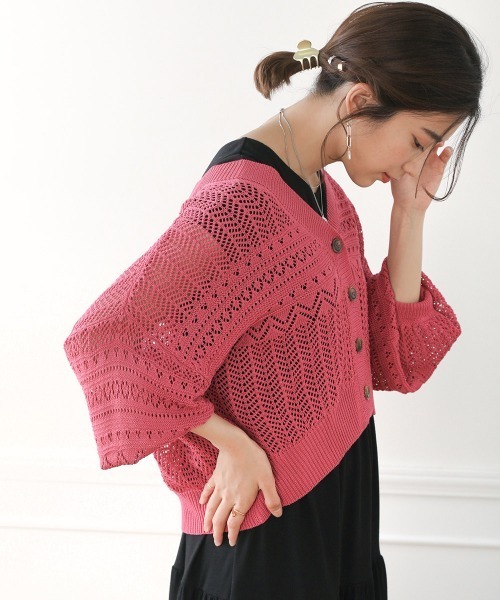 清涼感のある透かし柄ニットカーディガン ■POINT ほどよいゆとりで、コンパクトな丈感ですっきり着れるカーディガンです。 こなれ感をもたらす袖ボリュームシルエットも嬉しいポイント。 使いやすいニュアンスカラーから差し色に使えるビビットなカラーまで揃ってます。 ■FABRIC 初夏~真夏まで涼しげな印象になるざっくりとした透かし柄になっています。 ご自宅で手洗いOKなので今からの季節の羽織としておすすめ。 ■COORDINATE 目の粗い編地なので真夏にタンクトップやノースリーブの羽織などに大活躍する一枚です。 シュート丈なのでワンピースの上から羽織ってもすっきりとしシルエットに。 --------------- 透け感:あり ポケット:なし 伸縮性:なし --------------- ※撮影環境により、多少実際のカラーと異なる場合がございます。 また、携帯やスマートフォン、パソコンなどの画面上と実物では多少色が異なって見える場合がございます。ご了承下さいませ。 ※この製品は、素材や編み方の性質上、引っ掛け、引っ掛かりが起きやすい性質を持っています。お取り扱いには充分ご注意ください。 ※着脱時・着用時には、ベルト、バッグ、アクセサリー、周囲の壁などとの摩擦や引っ掛かりにご注意下さい。 ※その他お取り扱いに関しましては、商品に付属のアテンションタグをご覧ください。 ★商品のお気に入り登録登録すると、完売しても再入荷時に通知を受け取ることができます。 ほかにもお得な特典があるかもしれません♪ ★ブランドのお気に入り登録 新商品や再入荷などの情報を受け取ることができますので、是非ご登録ください♪