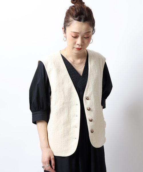 スタイリングの幅が広がるベスト。 コットンリネン素材なので、サマーシーズンにおすすめ! タンクトップやTシャツにプラスしたりワンピースの上から羽織っても素敵です。 同素材のパンツとセットアップでの着用もおすすめ! (22030701026220 コットンリネンジャガードパンツ) ※取り扱いについては、商品についている品質表示でご確認ください。 ※店頭・外での撮影画像は、光の当たり具合で色味が違って見える場合があります。 商品の色味は、スタジオ撮影の画像をご参照ください。 モデルサイズ:身長:163cm 着用サイズ:フリー 本体:手洗い可能