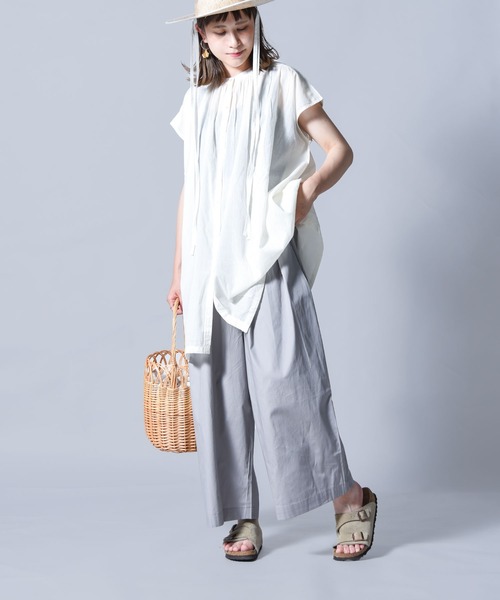 folkaの定番ワイドパンツ。夏素材で軽やかに仕上げました。 folkaで人気のワイド系パンツを今回はコクーンシルエットでお作りいたしました。 バルーンパンツやサーカスパンツより全体的にワイドに仕上げ、 裾に向かって少しカーブを描くようなコクーンシルエット。 そのボリューム感がたまらなく可愛い1本に仕上がりました。 今回はサマーパンツとして、軽めのコットンを使用。 真夏でも爽やかに着用いただけます。 薄手のコットンですが、透け感はありません。 ウエストはゴム使用なのでリラクシングな穿き心地。 ウエスト裏に紐もつけてあるのでサイズ調節も可能です。 シンプルなアイテムなのでお手持ちのアイテムとスッと馴染んでくれるはず。 シンプルなポケTやブラウスなどに合わせるだけでコーデが決まります。 シャツワンピのボトムに合わせても可愛いですね。 この夏のワイドパンツはこんなシルエットのパンツ、いかがですか? 【おすすめコーディネート】 シンプルなアイテムなので合わせるアイテムを選びません。 ポケTやボーダーTなどのTシャツ類からフリルブラウスやギャザーブラウスなどのブラウスまで相性抜群。 綺麗めにシャツを合わせても素敵に決まります。 オーバーシルエットのカラーシャツや袖ボリュームシャツ、とろみ系シャツとも合わせていただけます。 ストライプシャツを合わせれば爽やかな着こなしになること間違いなし。 トップスにワンピースを合わせるのもおすすめです。 カットソーワンピースやジャージワンピース、ロング丈ワンピースなどを合わせて女性らしい着こなしも。 シャツワンピースを羽織にした着こなしもオススメです。 アウターにはステンカラーコートがオススメ。Aラインのロング丈コートならトレンド感のあるコーデが完成します。 トレンチコートやマウンテンパーカーなどの定番アイテムとも相性バツグンです。 足元はバレエシューズやスクエアトゥパンプスを合わせれば女性らしいコーデに。 ローファーやドレスシューズでマニッシュに、スニーカーでカジュアルに。 合わせるアイテムによってコーディネートの印象がガラリと変わります。 フェイクレザーやレザー系のミニバッグを合わせれば上品な着こなしに。 キャンバストートやバックパックを合わせてカジュアルなコーデに仕上げるのもおすすめです。 定番で飽きのこないデザインなので長く使える1本。 お手持ちのワードローブにスッと馴染むアイテムです。 ///folka(フォルカ)/// About… デニムの名産地、岡山。 そんな岡山で数々のデニムブランドの生産を手がけてきた工場によるブランド、folka。 良いものを長く愛用し、丁寧に暮らす。 そんな毎日の心遣いを大切にする大人の女性に向けたカジュアルブランドです。 使いやすく、着回しがきく。トレンドに左右されない。 頑張りすぎない、だけどどこかこなれ感のある日常着を提案します。