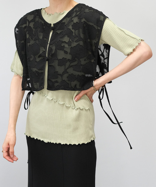 シアー生地と花柄デザインが上品でかわいいビスチェ。いつものコーディネートに合わせるだけでキレイめな雰囲気に。短めの丈なのでブラウスやワンピース、Tシャツなどキレイめやカジュアルなアイテムとのレイヤードが使いやすくおすすめです。サイドのリボンがさりげなくアクセントになりおしゃれな印象をプラス。■コーディネートアイテムワンピース…wm77x04985Tシャツ…ts80x04984パンツ…bg09c04839パンツ…br75c04590■商品仕様オーガンジー生地裏地…なし伸縮性…なし透け…ありポケット…なし付属品…なし着脱…前開きボタン※製造の都合上、柄のつなぎ目にズレが生じる場合がございます。※繊細な生地ですのでお洗濯などのお取り扱いには十分ご注意ください。詳しくは下げ札をご覧ください。※着用の際、摩擦や発汗により衣類やバッグ等に色移りの恐れ(特に淡色系のもの)がありますので、十分ご注意下さい。※透けますのでインナーの着用を推奨します。※ボタンの仕様は変更される場合がございます。【ご購入前に必ずご一読下さい】※モニタ環境によって、商品の色合いが多少異なる場合がございます。※色落ちの恐れがありますので、他のものと分けてお洗濯して下さい。※商品をお安く提供させて頂く為、検品後のアイロン掛けは省略させて頂いています。発送時も簡易梱包の為、お受け取り時にたたみ皺があると思いますがご了承下さい。