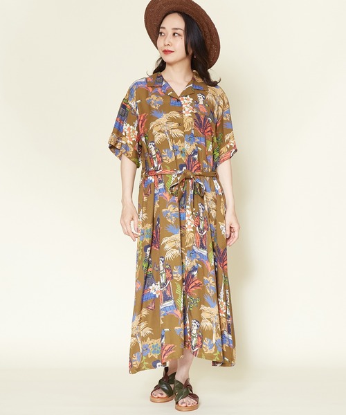 他では出逢えないメキシカンスタイル。民族芸術の第一人者、メキシコの画家「フリーダ・カーロ」をイメージしたアロハシャツワンピース。 カラフルな色合いとこだわりのプリントデザイン。 ウエストマークできるリボン付き。 前ボタンを開けてロングカーデ風に羽織るのもおすすめです。コーデの主役に◎ ・サイドポケット付き。 ※こちらの商品は1点1点職人による手作りとなります。その為、生地の取り方により柄の配置や形・色合いなど若干異なる場合がございます。(画像は一例です。)あらかじめご了承ください。 Amina Collection Co.,LTD.
