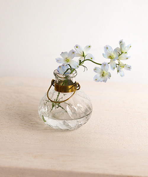 【商品名】 シナリーハンギングオーナメントベース オニオン 【商品説明】 一輪挿しとしても、オーナメントとしてぶら下げることでインテリアの装飾にもお使いいただけるハンドメイドのフラワーベース。 陽の光にあてると、ガラスと真鍮がキラキラと光りとても印象的。 オニオンはその名の通りたっぷりと膨らんだフォルムがつい手に取りたくなるような 可愛さです。 フラワーベースの首元にはハンギング構造の真鍮をあしらい、 蚤の市で見つけたような、時の経過を感じさせる一品となりました。 季節の草花を生けたり、オブジェとしてもお楽しみいただけます。 カラー違い、タイプ違いで並べて飾るのも◎ 【ブランド】 Sceneryvase (シナリーベース) 【商品仕様】 size: 約 φ75×h75mm 素材: ガラス、ブラス(真鍮) 原産国:インド 【商品注意事項】 【ガラス】 ・本製品は手作業のため仕上がりにばらつきがあります。製品の特性としてご理解ください。・ガラスは急激な温度変化で割れる場合があります。・熱湯は入れないでください。・たわしやクレンザー等は、くもりやキズ、破損の原因になりますので使用しないでください。 ・材質の特質上ガラスの内部に気泡が含まれます。・製造工程上、若干のキズ・欠けなどが含まれます。 ・小傷、真鍮のくすみも商品の風合いとなります。あらかじめご了承ください。 【真鍮】 ・真鍮は無塗装仕上げのため、黒くすんできます。経年変化をお楽しみください。・真鍮は柔らかく変形しやすいため、強い力を加えると変形する事があります。吊り下げる場合はご注意ください。・真鍮は湿気や水分に弱いため、濡れたままにしておくと変色や緑青(ろくしょう)の原因となります。水分が付着した場合は乾いた布でお拭きとりください。