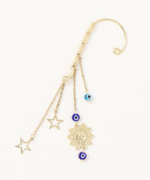 エキゾチックな魅惑の世界観が非日常へと誘う。 他人の邪悪な視線や嫉妬から身を守るトルコのお守り「ナザール・ボンジュウ」をイメージしたガラスビーズと、メタルの透かしパーツが耳元で揺れるイヤーフック。青は生命の源であり、魔を払うとされています。 ピアスホールが開いていない方でも、耳元のお洒落を気軽に楽しめるアクセサリー。顔周りの印象を華やかにしてくれます☆ ※こちらの商品は1点1点職人による手作りとなります。その為、形や色合いなど若干異なる場合がございます。あらかじめご了承ください。 Amina Collection Co.,LTD.