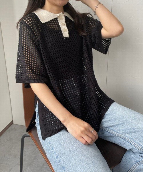 ざっくりとしたメッシュ編みが抜け感を演出してくれるメッシュポロ●detail程よい肌見せでヘルシーなスタイリングが叶うアイテム。襟の色味を変えることでポイントとなりコーデのアクセントに。オーバーサイズに仕上げてゆるっと抜け感のあるサイズ感。サイドの深めに入ったスリットでメリハリのあるデザインに。トレンドのレイヤードスタイルを楽しめる一枚です。●fabric柔らかくサラッとした清涼感のあるサマーニット素材。通気性が良く着心地抜群です。●coordinateキャミやタンクを仕込んで重ねるだけで今年らしいトレンドスタイルが完成。ボトムは派手色のカラーパンツやスカートで目を惹くスタイリングに。定番のデニム合わせで爽やかな夏らしいスタイリングもオススメです。ブランド品番:163565