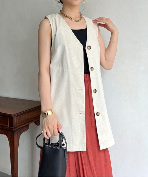 スタイリングを格上げしてくれるリネン混ベスト ●ノーカラーデザインできれいめからカジュアルスタイルまで幅広く使える一着 ●ナチュラルな風合いが大人のリラックスムードを演出 ●ボタンを留めて、開けて羽織っても着回し出来るジレアイテム ●お尻が隠れる着丈で体型カバーできます ●サイドポケットが付いてるのもポイント◎ -------------------------------------------------------------- 生地の厚さ:普通 伸縮性:なし 透け感:ややあり 裏地:なし 洗濯方法:ご自宅で洗濯可 -------------------------------------------------------------- ※商品のお取り扱いに関しましては、商品に付属の アテンションカード、洗濯ネームをご覧ください。 ※撮影場所やお使いのモニター環境により若干お色味が 異なる場合がございます。 特にロケの撮影では明るく見える傾向にございます。 ※サイト上ではフリーサイズの表記ですが、商品タグには Mサイズと表記されている場合がございます。 その場合、ワンサイズでのご用意となりますのでサイズミス などではございません。詳しいサイズはサイズスペックを ご確認いただきますようお願い致します。 ※サイト上でのカラー名とお届けした商品に記載されている カラー名が異なる場合がございますので予めご了承ください。 --------------------《Information》-------------------- 【商品のお気に入り登録】 →カートに入れる右側の【♡マーク】をクリック! 完売カラーの再入荷通知やラスト1点の通知、 セールの通知を受け取ることができます。 【ブランドのお気に入り登録】 →ブランドタグのページから【♡お気に入りショップに追加】 をクリック! 新商品や再入荷など、ブランドのお得な情報を いち早く受け取ることができます。 是非ご登録頂き、お買い物をお楽しみください◎ <返品・キャンセルについて> ・着用・洗濯後の返品は致しかねます。 ・商品到着後、着用前に商品を確認して頂きますようお願い致します。