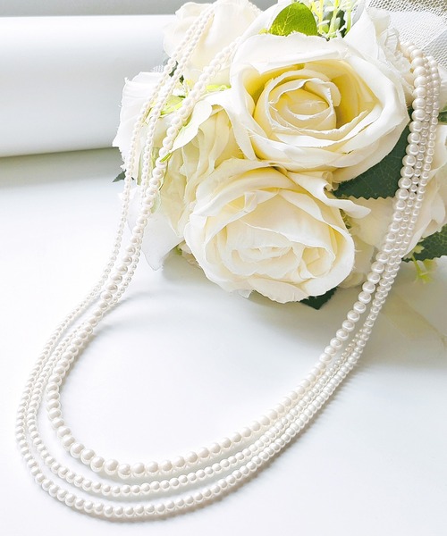 まるでリアルパールのような美しい輝きの艶めく3連フェイクパールネックレス。華やかなパールの輝きがデコルテを美しく飾り立てます。◆Like a Real pearl限りなくリアルに近い上質なフェイクパールを使用。艶めく輝きが上品リッチな質感です。◆Fastener着脱が簡単な差し込み式の留め具です。取り外す際も抑えを押しながら引き抜くだけなので手間を感じません。◆Triple大小のパールを3連に重ねたデザインがよりラグジュアリーでフェミニンなムードを引き立てます。◆使えるシーンは色々パーティー・結婚式・二次会・食事会・セレモニー・入園式・入学式・卒園式・卒業式・フォーマル