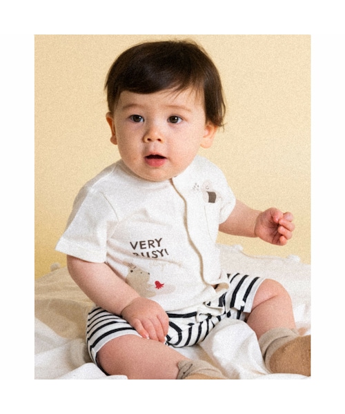 アニマル×たべもののプリントを施した男の子用ロンパース。 上身頃と下身頃で素材を変えることで、セパレート風のデザインに仕上げました。 お子さまらしい可愛いプリントがこだわりのポイントです。 くま(ホワイト)、チーター(イエロー)、恐竜(グリーン)の3種類展開です。
