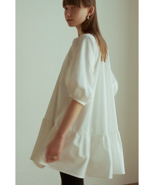 裾のボリューム感が映えるミニワンピース。 女性らしい仕上がりですが、張り感のある生地と立体的なパフスリーブでモードな印象をプラスしました。体のラインを拾わないデザインと、肘まである袖丈が体型をカバーしてくれます。パンツとレイヤーしたスタイリングもおすすめです。